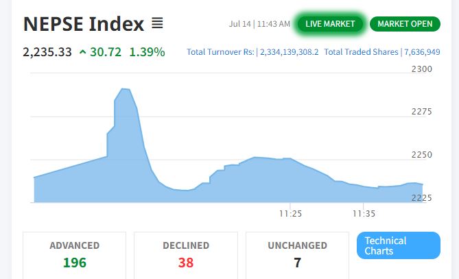 यो समाचार तयार पार्दा (११ः ४५) बजेसम्म नेपाल स्टक एक्सचेन्ज (नेप्से) ३०.७२ अंकले बढेको छ । योसँगै शेयर बजार २२३५ दशमलव ३३ बिन्दुमा पुगेको छ।