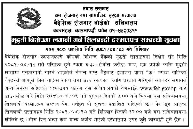 काठमाडौं – श्रम, रोजगार तथा सामाजिक सुरक्षा मन्त्रालयअन्तर्गतको वैदेशिक रोजगार बोर्ड सचिवालयले मुद्दती निक्षेपमा लगानी गर्ने भएको छ । बाेर्डले एक वर्षे अवधिका लागि ३३ करोड रुपैयाँ मुद्दती निक्षेपमा लगानी गर्न लागेको हो।