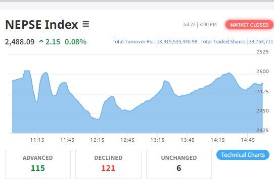 काठमाडौं – साताको दोस्रो दिन सोमबार शेयर बजार सामान्य बढेर बन्द भएको छ। आज शेयर बजार नेपाल स्टक एक्सचेञ्ज नेप्से (नेप्से) परिसूचक २ दशलमव १५ अंकले बढेर २,४८८ को विन्दुमा कायम भएको छ । आज ११५ कम्पनीको शेयर मूल्य बढेको छ भने १२१ कम्पनीको शेयर मूल्य घटेको छ ।