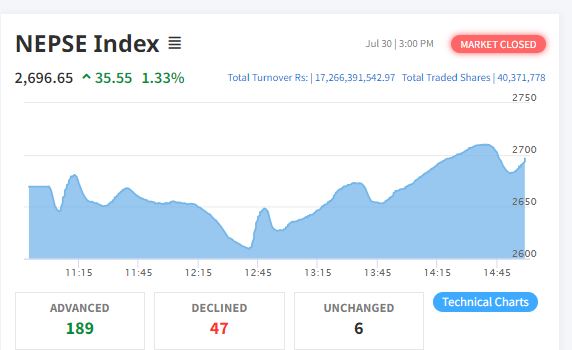 काठमाडौं – साताको तेस्रो कारोबारको दिन मंगलबार शेयर बजारमा दोहोरो अंकको वृद्धि देखिएको छ। सोमबार घटेको बजार आज ३५ दशमलव ५५ अंकले बढेर २६९६.६५ को विन्दुमा पुगेको छ ।