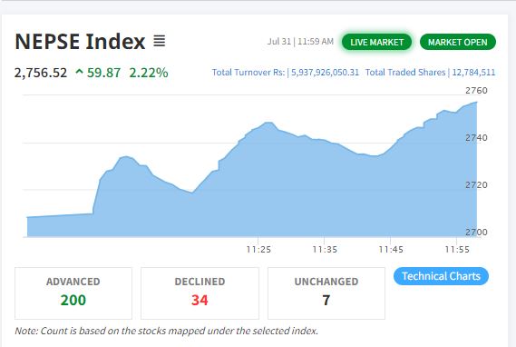 १२  बजेसम्म १ करोड २७ लाख ८४ हजार ५ सय ११ कित्ता शेयर किनबेच हुँदा ५अर्ब ९३  करोड ७९ लाख २६ हजार रुपैयाँको शेयर कारोबार भएको छ । नेप्से भने ५९.८७ अकंले बढेर २७५६ बिन्दुमा पुगेको छ ।