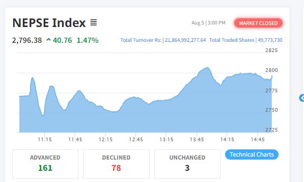 आज १ सय ६३ कम्पनी नाफामा जाँदा ७८ कम्पनी घाटामा गएका छन् । आज ३२६ कम्पनीको ४ करोड ९७ लाख ७३ हजार ७३० कित्ता शेयर किनबेच हुँदा २१ अर्ब ८६ करोड, ४९ लाख ९२ हजार २ सय ७७ रुपैयाँको कारोबार भएको छ ।