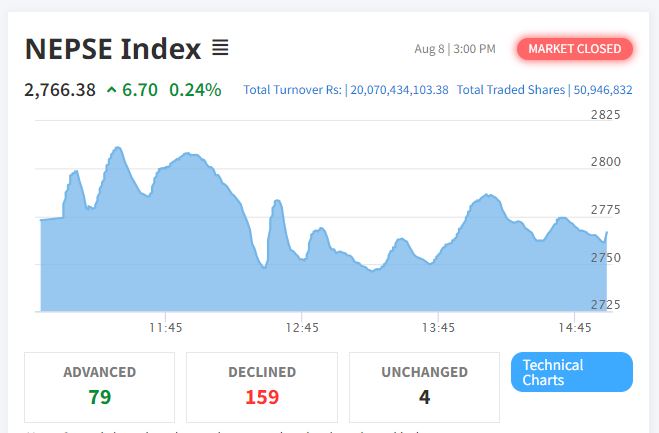 काठमाडौं – साताको अन्तिम कारोबारको दिन बिहीबार शेयर बजारमा सामान्य अंकको वृद्धि देखिएको छ । आज शेयर बजार नेप्से परिसूचक ६ दशलमव ७० अंकले बढेर २,७६६ को विन्दुमा कायम भएको हाे । आज ७९ कम्पनीको शेयर मूल्य बढेको छ भने १५९ कम्पनीको शेयर मूल्य घटेको छ ।