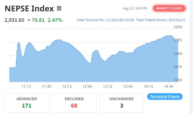 यसक्रममा आज ६ करोड ४८ लाख कित्ताभन्दा बढी शेयर किनबेच भएको छ । आज १७१ वटा कम्पनीको शेयर मूल्य बढ्दा ६८ वटा कम्पनीको मूल्य घटेको छ भने ३ वटाको स्थिर कायम छ । आज ७ वटा कम्पनीको शेयर मूल्यमा सकरात्मक सर्किट लागेको छ भने १२ कम्पनीको शेयर मूल्य ९ प्रतिशतभन्दा बढीले बढेको छ ।