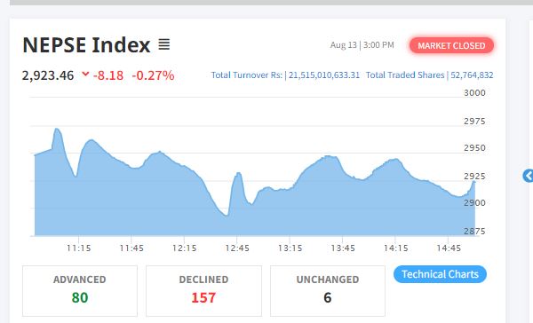 आज ८.१८ अंकले घटेको बजारमा ३३२ कम्पनीको ५ करोड २७ लाख ६४ हजार ८३२ कित्ता शेयर किनबेच हुँदा २१ अर्ब ५१ करोड ५० लाख रुपैयाँको शेयर कारोबार भएको छ । आज ८० कम्पनीको शेयर मूल्य बढेको छ भने १५७ कम्पनीको शेयर मूल्य घटेको छ ।