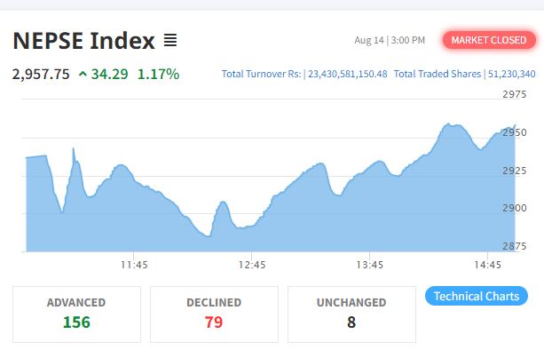 काठमाडौं – साताको चौथो करोबारको दिन बुधबार शेयर बजारमा दोहोरो अंकको वृद्धि देखिएको । आज शेयर बजार मापक नेप्से परिसूचक नेप्से ३४. २९ अंकले बढेको हो । आज १५६ वटा कम्पनीको शेयर मूल्य बढेको छ भने ७९ कम्पनीको घटेको छ।