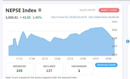 यससँगै नेप्से परिसूचक ३ हजार अंकमाथि पुगेर बन्द भएको छ । यो पछिल्लो ३ वर्षयताकै उच्च बिन्दु हो । यसअघि सन् २०२१ को सेप्टेम्बरमा नेप्से परिसूचक ३ हजार अंकमाथि थियो । त्यसयता आज पहिलोपटक उच्च बिन्दुमा पुगेको हो । यस्तै, आज नेप्सेमा किर्तिमानी ३० अर्ब रुपैयाँको कारोबार भएको छ । २९ अर्ब ९५ करोड रुपैयाँभन्दा बढीको कारोबार भएसँगै कारोबारमा किर्तिमान बनेको हो । यसअघि २७ अर्ब २४ करोड रुपैयाँको उच्च कारोबारको किर्तिमान थियो ।