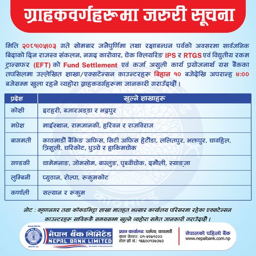 काठमाडौं – सरकारले जनैपूर्णिमाको अवसरमा आज देशभर सार्वजनिक बिदा दिएको छ । आज सार्वजनिक बिदा भए पनि केही वाणिज्य बैंकहरूले सेवा दिइरहेका छन् ।