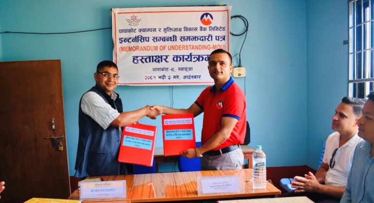 उक्त समझ्दारी पत्रमा मुक्तिनाथ विकास बैंकका गण्डकी क्षेत्रीय प्रमुख ऋषिराम ढकाल र चापाकोट क्याम्पसको तर्फबाट क्याम्पसका कार्यवाहक प्रमुख पोषराज देवकोटाले हस्ताक्षर गरे । सम्झौताअनुसार स्नातक तहमा अध्ययनरत विद्यार्थीहरुलाई इन्टर्नशिप, वित्तीय साक्षरता कार्यक्रम सञ्चालन गरिनेछ ।
