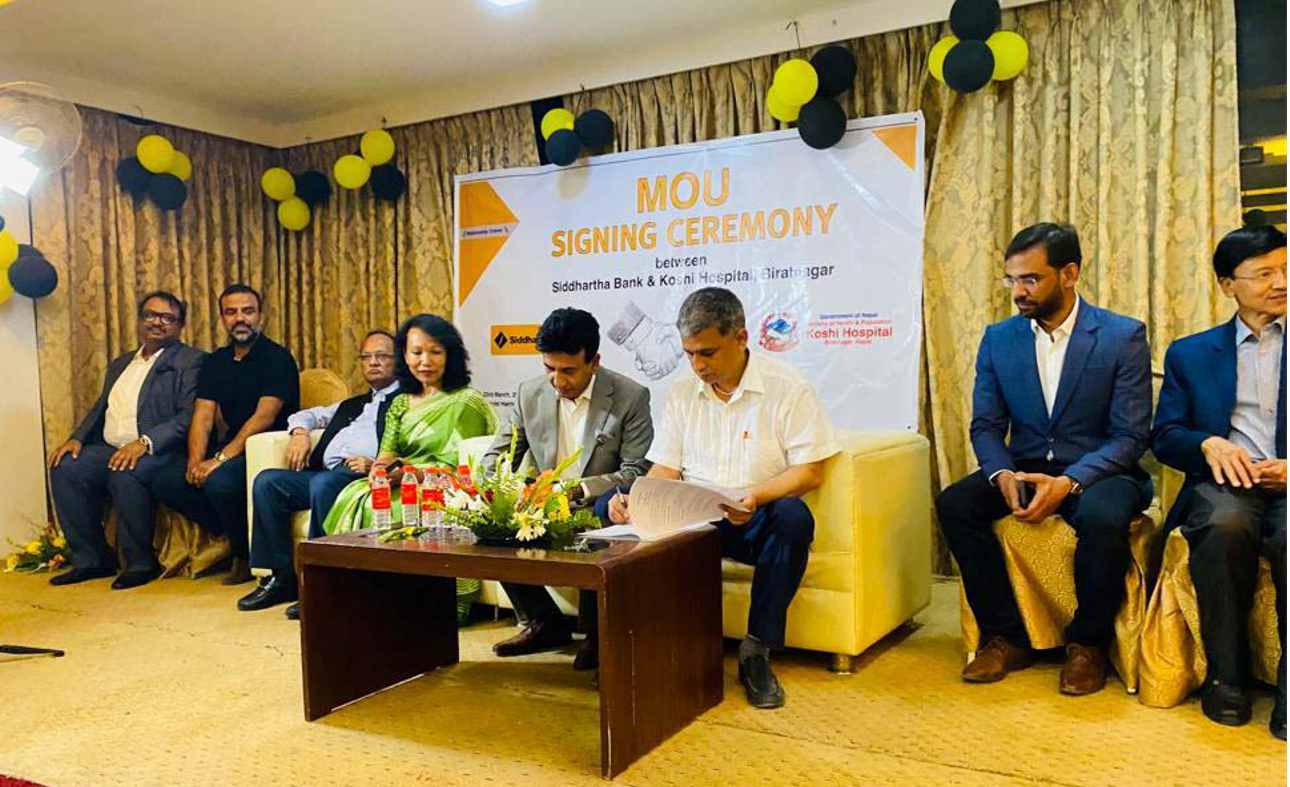 उक्त सम्झौता पत्रमा सिद्धार्थ बैंकका तर्फबाट बैंकका प्रमुख कार्यकारी अधिकृत सुन्दर प्रसाद कडेल र कोशी अस्पतालका तर्फबाट मेडिकल सुपरिटेण्डेन्ट डा. यज्ञराज खरेलले हस्ताक्षर गरेका हुन ।
