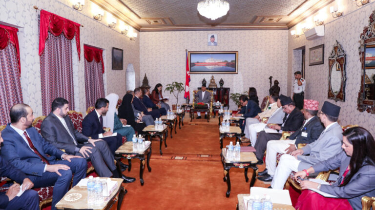 काठमाडाैं – नेपालको दुई दिने औपचारिक भ्रमणका क्रममा सोमबार यहाँ आएका विदेशमन्त्री अल्बुसइदीले राष्ट्रपति भवन शीतल निवासमा आज राष्ट्रपति पौडेलसँग भेट गरेका हुन् । भेटका क्रममा राष्ट्रपति पौडेलले नेपालले सन् २०२६ सम्ममा अतिकम विकसित मुलुकको सूचीबाट स्तरोन्नति भइ सन् २०३० सम्म मध्यम आय भएको मुलुक बन्ने लक्ष्य लिएको उल्लेख गर्दै त्यसका लागि ओमनबाट सहयोगको अपेक्षा गरेका राष्ट्रपतिका प्रेस सल्लाहकार किरण पोखरेलले जानकारी दिए ।