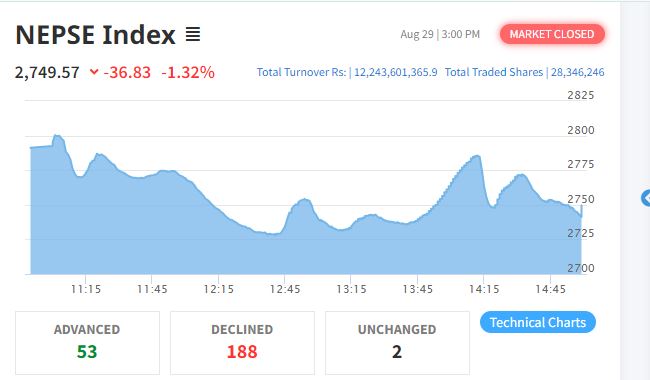 काठमाडौं – आज साताको अन्तिम दिन बिहिबार शेयर बजार दाेहाेराे अंकले घटेकाे छ । आज नेपाल स्टक एक्सचेन्ज (नेप्से) परिसूचक दोहारो अंक अर्थात् ३६ दशमलव ८३ अंकले घटेर २,७४९ दशमलव ८३ को विन्दुमा कायम भएको छ ।