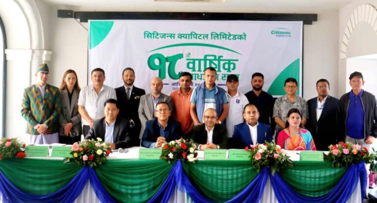 काठमाडौं –सिटिजन्स क्यापिटलको आज सम्पन्न १८औँ वार्षिक साधारणसभाबाट १५.५ प्रतिशत नगद लाभांश अनुमोदन भउको छ। काठमाडौंको ज्ञानेश्वरस्थित एटिक मिटिङ हलमा सम्पन्न वार्षिक साधारणसभाले आर्थिक वर्ष २०८०।८१ को मुनाफाबाट १५.५० प्रतिशत नगद लाभांश बाँड्ने प्रस्ताव पारित गरेको हो ।