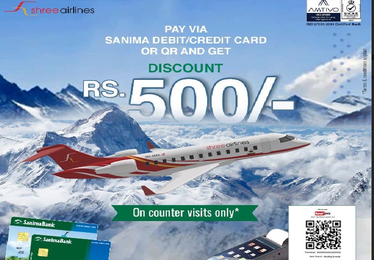 सानिमा बैंकको भिसा डेबिट/क्रेडिट कार्ड वा मोबाइल बैंकिङ्ग गरी डिजिटल भुक्तानी गर्दा श्री एयरलाइन्सको टिकटमा ५०० रुपैयाँको छुट प्राप्त गर्न सक्नेछन् । छुटका लागि ग्राहकहरुले श्री एयरलाइन्सको काउन्टरबाट भुक्तानी गर्नु पर्नेछ ।