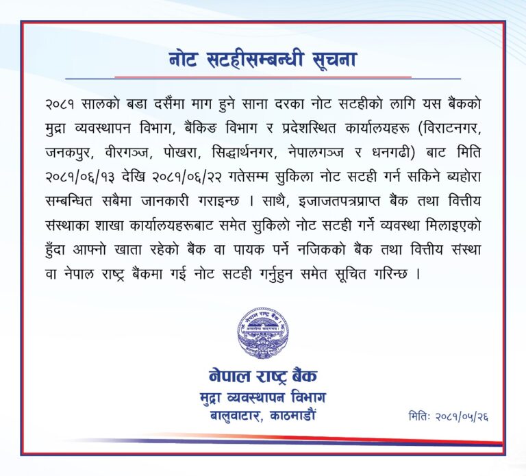 काठमाडौं – नेपाल राष्ट्र बैंकले यस वर्षको दसैँलाई लक्षित गर्दै असोज १३ गतेदेखि नोट सटही सुविधा खुला गर्ने भएको छ। विगतका वर्षमा नयाँ नोट दिँदै आएको केन्द्रीय बैंकले यस वर्ष सर्वसाधारणका लागि सुकिला नोट मात्रै दिने गरी असाेज १३ गतेदेखि २२ गतेसम्म सटही सुविधा खुलाउन लागेको हो।