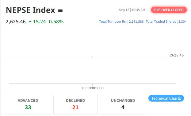 यो ०.५८ प्रतिशतको वृद्धि हो । यससँगै परिसूचक २६ सय २५ अंकमा पुगेर रोकिएको छ । आजको प्रि ओपन सेसनमा कारोबार भएकामध्ये ३३ वटा कम्पनीको शेयर मूल्य बढेको छ ।