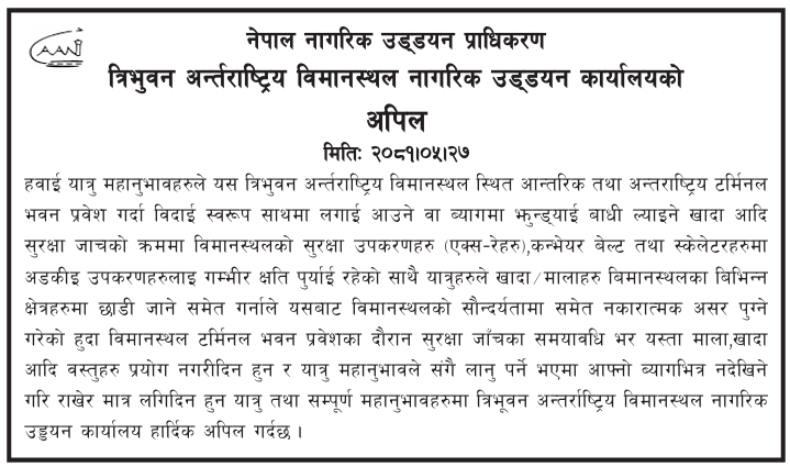 हवाई यात्रु तथा तिनका आफन्तलाई लक्षित गरी खादा वा माला नल्याउन कार्यालयले अपिल गरेको छ। हवाई यात्रुले लगाएर आउने खादा, माला वा झोलामा बाँधेर ल्याउने खादाले सुरक्षा जाँचका क्रममा विमानस्थलका सुरक्षा उपकरणमा गम्भीर क्षति पुर्याइरहेको कार्यालयले जनाएको छ।