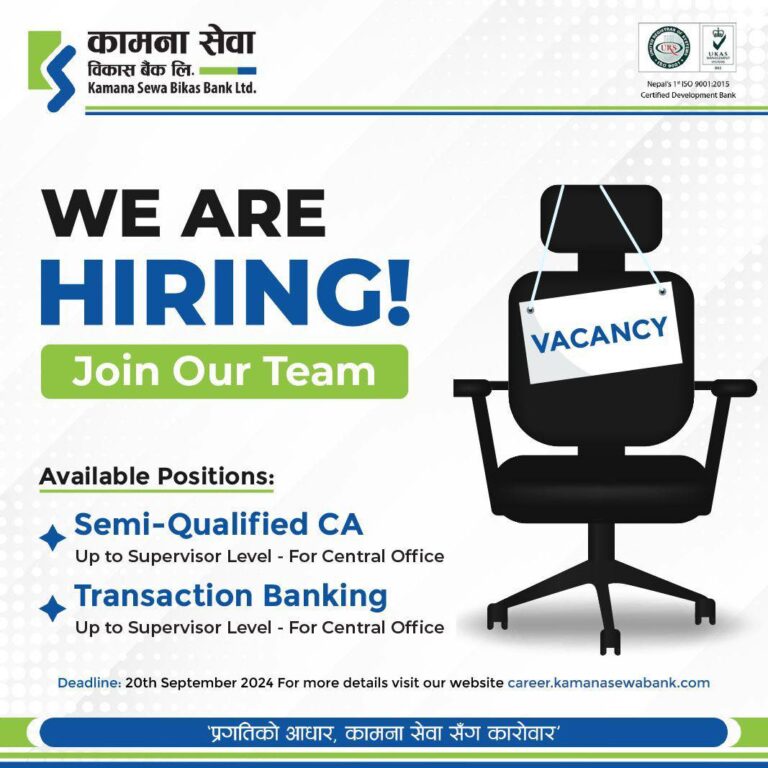 काठमाडौं – कामना सेवा विकास बैंक लिमिटेडले कर्मचारी माग गरेकाे छ । बैंकले बिहीबार (आज) एक सूचना जारी गर्दै सेमि–क्वालिफाइड सीए र ट्रान्सेक्सन बैंकिङ्गमा कर्मचारी मागेकाे हाे ।