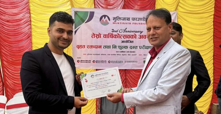 काठमाडौं – मुक्तिनाथ फाउण्डेशनले आफ्नो तेस्रो वार्षिकोत्सव अवसरमा रक्तदान रक्तदान कार्यक्रम सम्पन्न गरेको छ । तेस्रो वार्षिकोत्सवमा आयोजित रक्तदान कार्यक्रममा ५५ पोका रगत संकलन भएको थियो । साथै वार्षिकोत्सवको अवसरमा ४८ जनाले निस्शुल्क दन्त परीक्षण सेवा लिएका छन् ।