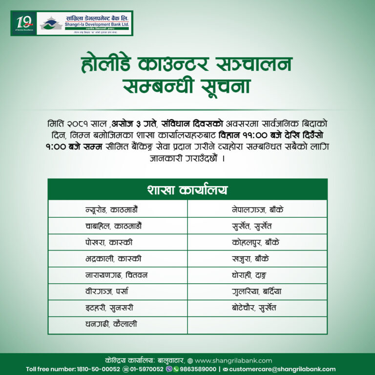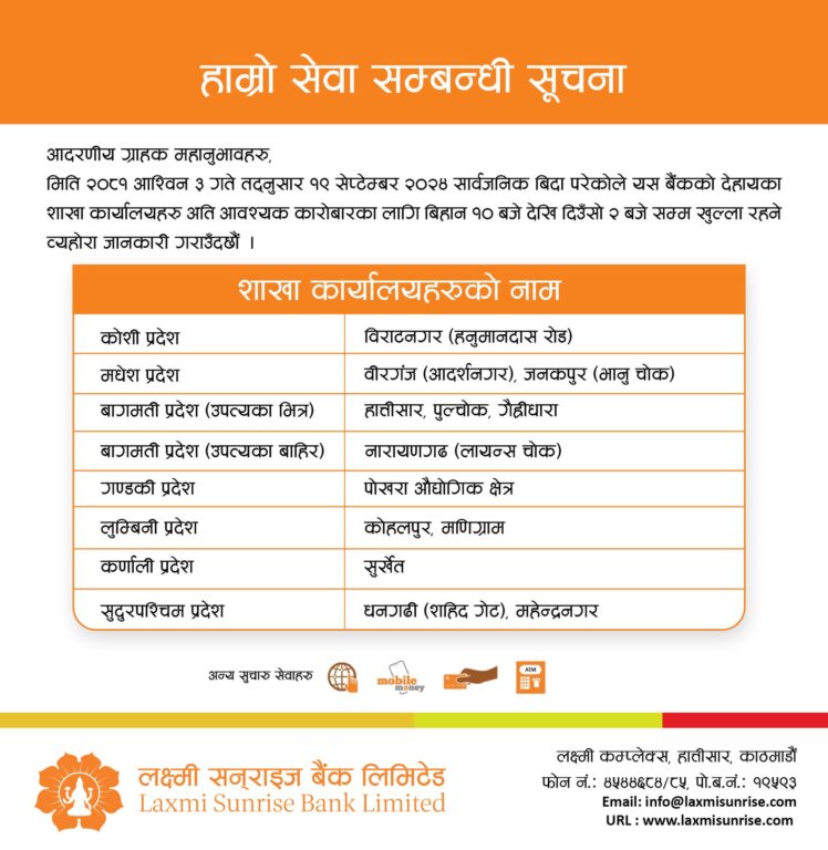 तर, सम्पूर्ण शाखा संचालन नगरेपनि केहि शाखा मार्फत बैंकहरुले बिदाका दिन समेत सेवा प्रदान गरिहेका छन्। आफ्ना ग्राहकहरुको आवश्यकतालाई मध्यनजर गर्दै केही बैंकहरुले बैंकिङ्ग सेवा प्रदान गरिरहेका हुन् ।