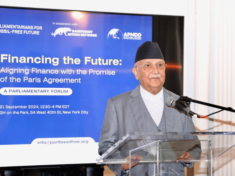 नेपाली प्रतिनिधिमण्डलको नेतृत्व गर्दै संयुक्त राष्ट्रसंघको ७९औँ महासभामा भाग लिने क्रममा संयुक्त राज्य अमेरिकाको न्युयोर्क आइपुगेका प्रधानमन्त्री ओलीले स्थानीय समय अनुसार शनिबार दिउँसो आयोजित जीवाष्म इन्धनमुक्त संसदीय सञ्जाल (पार्लियामेन्टेरियन्स फर फोसिल फ्युल फ्रि) को कार्यक्रममा मुख्य वक्ताका रूपमा सम्बोधनका क्रममा उक्त कुरा बताएका हुन्।