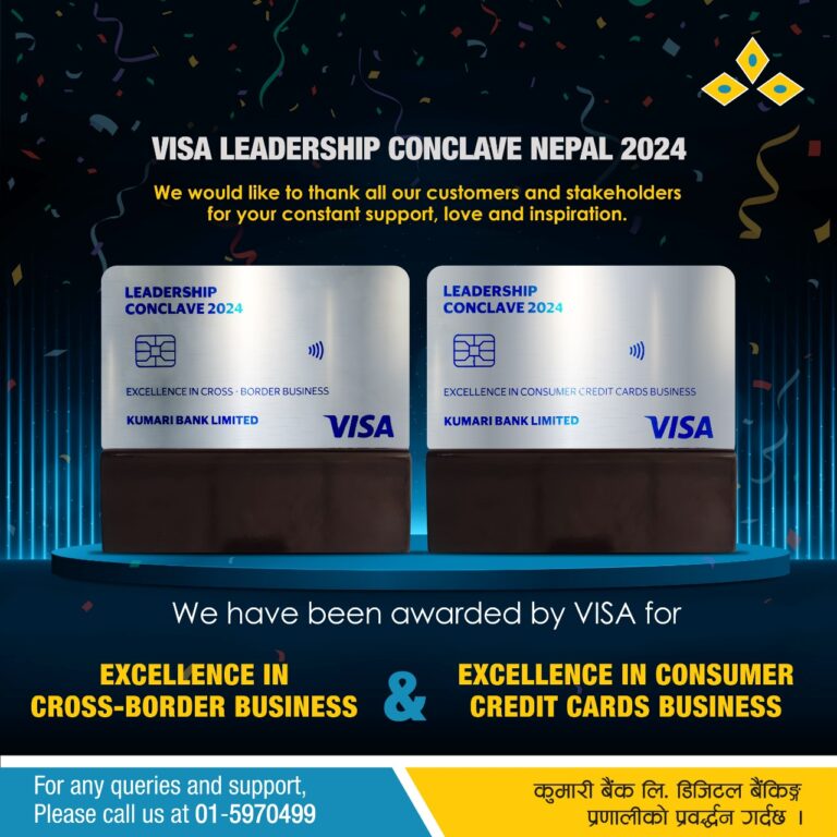 काठमाडौं – भिसा इन्टरनेसनलले आयोजना गरेको ‘लिडरसिप कन्क्लेभ नेपाल–२०२४’ सम्मेलनमा कुमारी बैंक दुई अवार्डबाट सम्मानित भएको छ। असोज ४ गते आयोजित सम्मेलनमा भिसा इन्टरनेसनलले कुमारी बैंकलाई ‘एक्सिलेन्स इन कन्ज्युमर क्रेडिट कार्डस् बिजनेस’ र ‘एक्सिलेन्स इन क्रस बोर्डर बिजनेस’ अवार्डहरुबाट सम्मानित गरेको छ ।