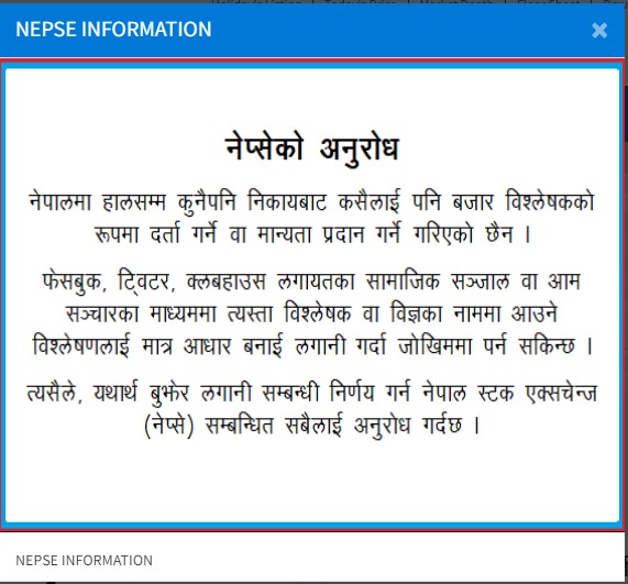 नेप्सेले फेसबुक, ट्विटर, क्लब हाउसलगायतका सामाजिक सञ्जाल वा आमसञ्चारका माध्यममा त्यस्ता विश्लेषक वा विज्ञका नाममा आउने विश्लेषणलाई मात्र आधार बनाई लगानी गर्दा जोखिममा पर्न सकिने सम्बन्धी नेप्सले सचेत गराएकाे हाे ।