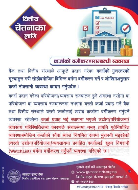 काठमाडौं – बैंक तथा वित्तीय संस्थाले कर्जाको गुणस्तर मूल्यांकन, वर्गीकरण र नोक्सानी व्यवस्था कायम गर्नुपर्छ। केही कर्जालाई बैंकहरुले सूक्ष्म निगरानीमा पनि राख्नुपर्ने प्रावधान रहेको छ। केन्द्रीय बैंकले वित्तीय चेतनाका लागि चेतनाका लागि सूचना जारी गर्दै साे विषयमा जानकारी दिएकाे हाे ।