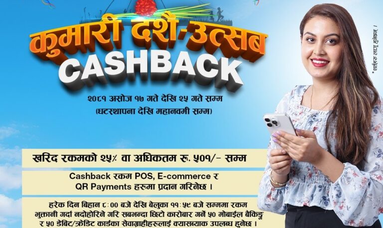 काठमाडौं – कुमारी बैंकले दशैं उत्सव क्यासब्याक अफर सञ्चालनमा ल्याएको छ । बैंकका सेवाग्राहीले डेबिट कार्ड, क्रेडिट कार्ड तथा मोबाइल बैंकिङ्गमार्फत वस्तु तथा सेवा खरिद बापतको रकम भुक्तान गर्दा प्रत्येक दिन ५० कार्ड प्रयोगकर्ता तथा ५० मोबाइल बैंकिङ्ग प्रयोगकर्ताले खरिद मूल्यको २५ प्रतिशत वा अधिकतम ५०१ रुपैयाँ बराबरको क्यासब्याक प्राप्त गर्न सक्नेछन्।