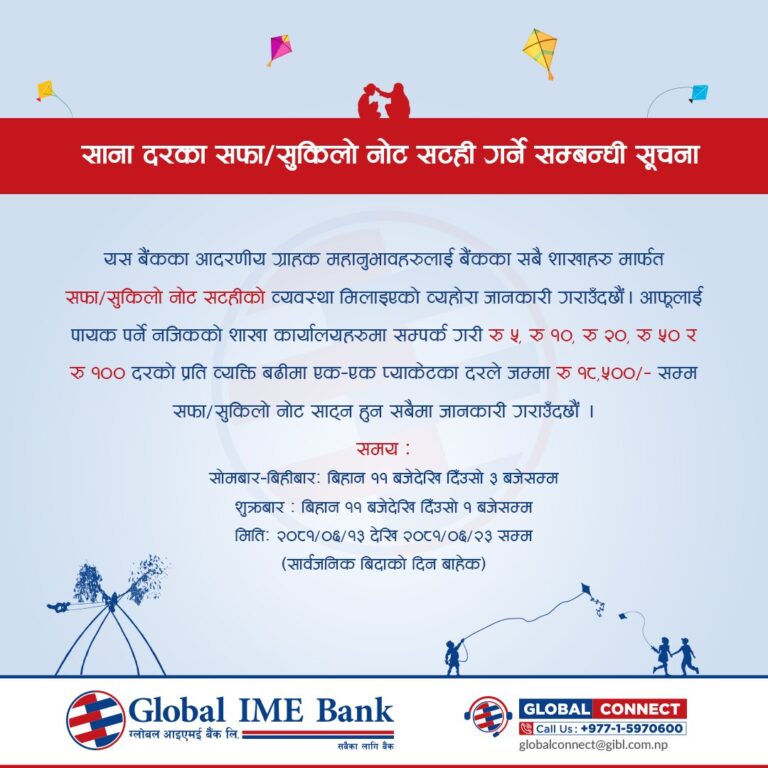 काठमाडौं – नजिकिँदै  गरेको दशैंलाई लक्षित गर्दे ग्लोबल आईएमई बैंकले आफ्ना सबै शाखामार्फत सुकिला नोट सटहीको व्यवस्था गरेको छ । बैंकले सोमबार, बिहीबार बिहान ११ बजेदेखि दिँउसो ३ बजेसम्म / शुक्रबार बिहान ११ बजेदेखि दिँउसो १ बजेसम्म सफा नोट सटही गर्ने सुविधा दिने भएकाे छ ।