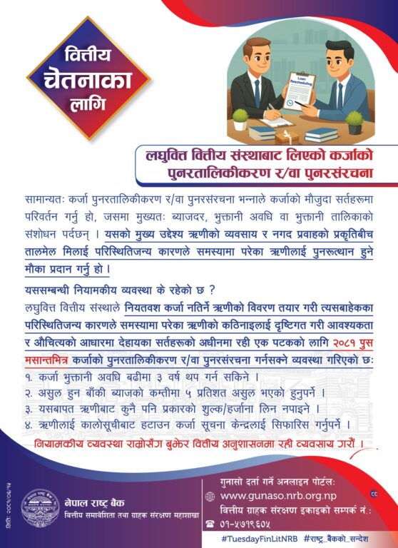 वित्तीय समावेशिता तथा ग्राहक संरक्षण महाशाखाले जारी गरेको सन्देशमा भनिएको छ, ‘सामान्यतः कर्जा पुनरतालिकीकरण ररवा पुनरसंरचना भन्नाले कर्जाको मौजुदा सर्तहरूमा परिवर्तन गर्नु हो, जसमा मुख्यतः ब्याजदर, भुक्तानी अवधि वा भुक्तानी तालिकाको संशोधन पर्दछन् । यसको मुख्य उद्देश्य ऋणीको व्यवसाय र नगद प्रवाहको प्रकृतिबीच तालमेल मिलाई परिस्थितिजन्य कारणले समस्यामा परेका ऋणीलाई पुनरूत्थान हुने मौका प्रदान गर्नु हो ।’