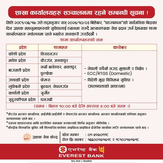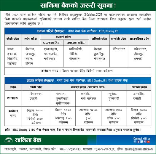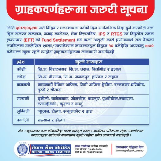 बिदाका दिन समेत बैंकहरुले भने बैंकिङ्ग सेवा प्रदान गर्ने भएका छन् । सार्वजनिक बिदाको दिनपनि आफ्ना ग्राहकहरुको आवश्यकतालाई मध्यनजर गर्दै अधिकांश वाणिज्य बैंकहरुले बैंकिङ्ग सेवा प्रदान गर्ने भएका हुन् । बैंकहरुले सम्पूर्ण शाखा संचालन नगरेपनि केहि शाखा मार्फत सेवा प्रदान गरिरहेका छन्।