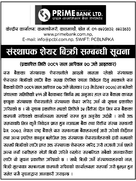 काठमाडौं – प्राइम कमर्सियल बैंक लिमिटेडले विभिन्न संस्थापक शेयरधनीहरूको नाममा रहेको शेयर बिक्रीमा ल्याएको छ । बैंकले आफ्ना संस्थापक शेयरधनीहरूका लागि बिक्री गर्न लागेकाे शेयरको संख्या खुलाएको छैन ।
