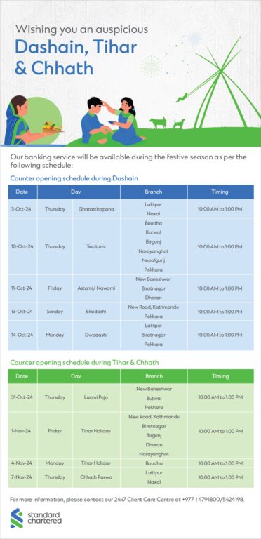 काठमाडौं – स्ट्याण्डर्ड चार्टर्ड बैंक लिमिटेडले दसैंमा पनि बैंकिङ्ग सेवा दिने भएको छ । बैंकले ग्राहकको आवश्यकतालाई मध्यनजर गर्दे दसैंमा पनि बैंकिङ्ग सेवा दिन लागेको बताएको हो ।