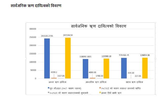 असोज मसान्तसम्म कायम कूल तिर्न बाँकी सार्वजनिक ऋणको आकार कूल गार्हस्थ्य उत्पादन (जीडीपी) को तुलनामा ४४.२३ प्रतिशत रहेको छ । यदी कूल तिर्न बाँकी ऋणलाई कूल जनसंख्याले भाग गर्ने हो भने प्रतिव्यक्तिको थाप्लोमा ८६ हजार ७ सय रुपैयाँ बढी पर्ने देखिन्छ ।