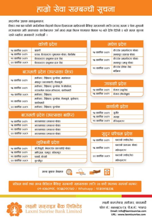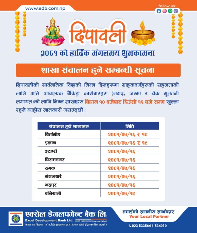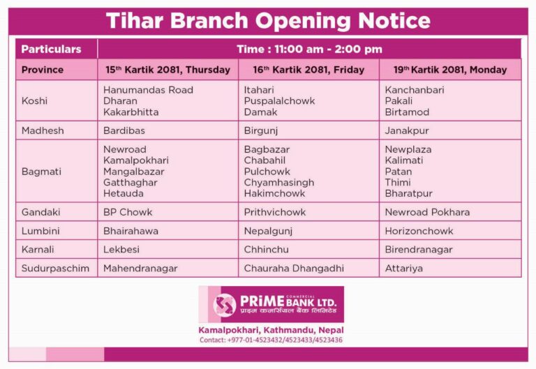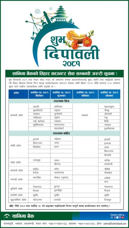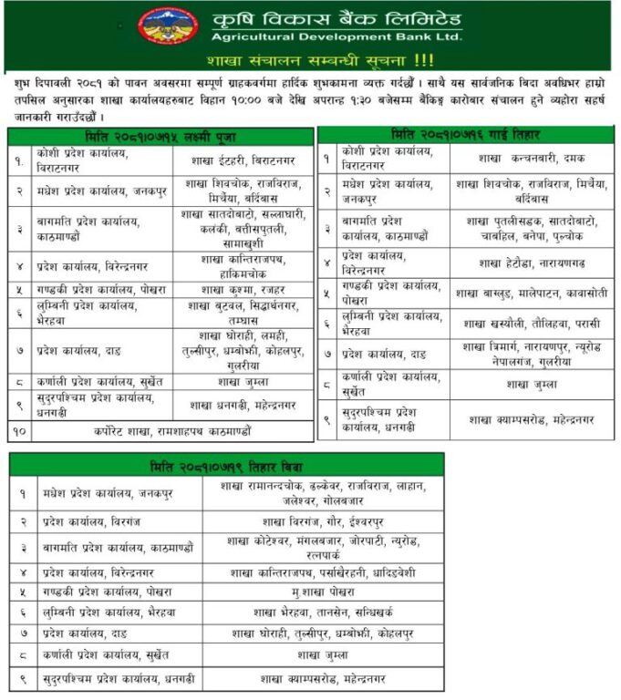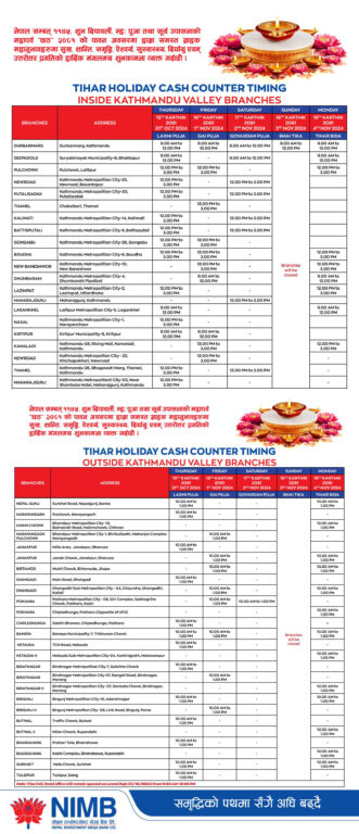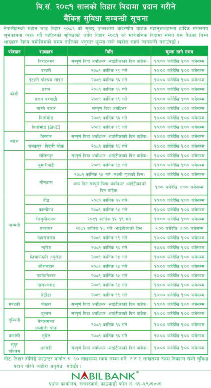तर, बैंक तथा वित्तीय संस्थाहरूले भने तिहार बिदामा पनि आफ्नो सेवा प्रदान गर्ने जनाएका छन् । तिहार बिदाको समयमा अधिकांश बैंकहरूले आफ्ना निश्चित शाखा कार्यालय खुला राखेर सेवा दिने भएका हुन् ।