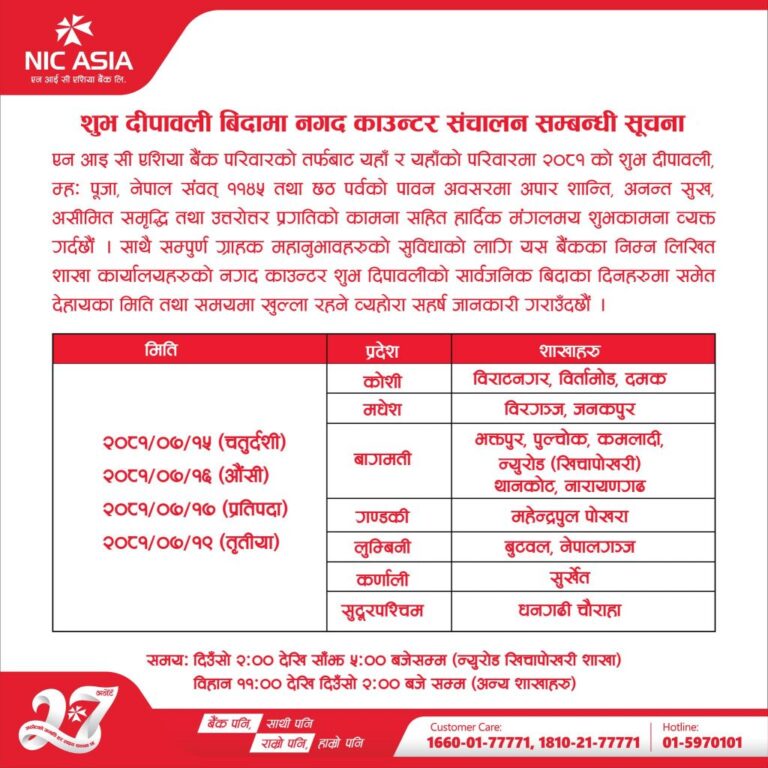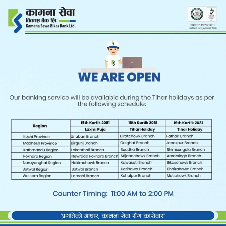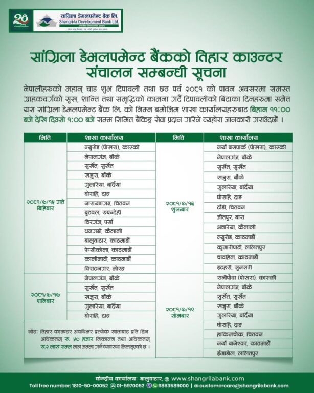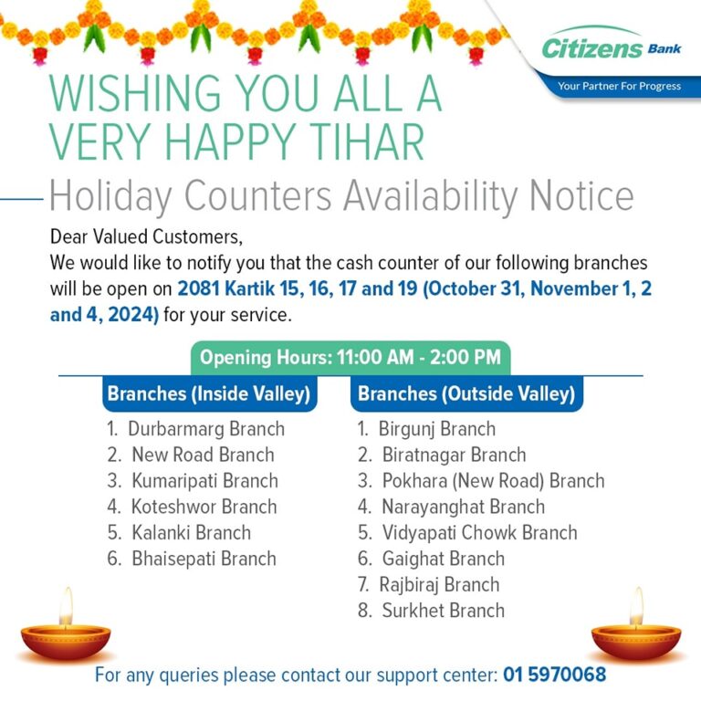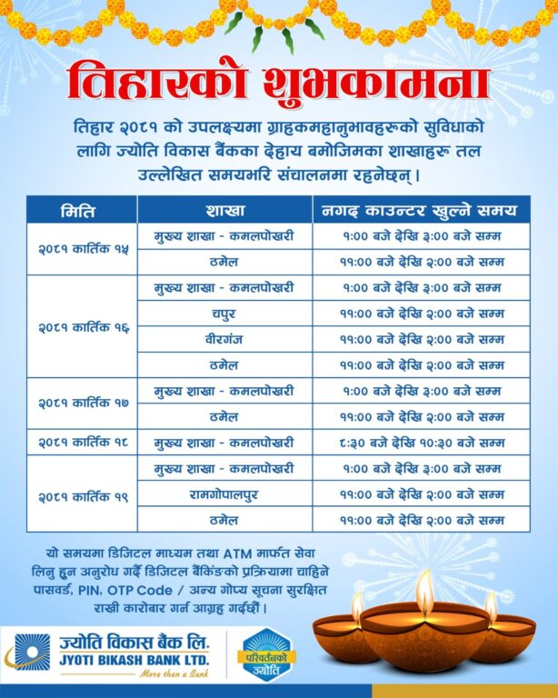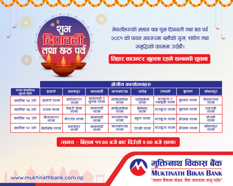 काठमाडाैं – तिहार बिदामा पनि बैंकहरुले सेवा दिएका छन् । वाणिज्य तथा विकास बैंकहरुले यस वर्षको तिहार तथा छठ बिदा अवधिमा पनि शाखा तथा विभिन्न काउन्टर सञ्चालन गरि सेवा दिने भएका हुन् ।