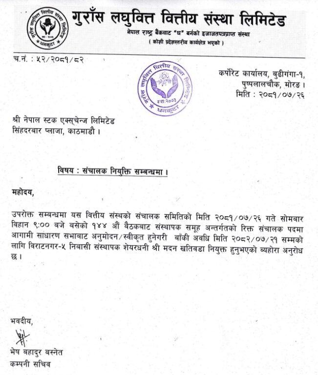 काठमाडौं – गुराँस लघुवित्त वित्तीय संस्था लिमिटेडको सञ्चालकमा संस्थापक शेयरधनी मदन खतिवडा नियुक्त भएका छन्।