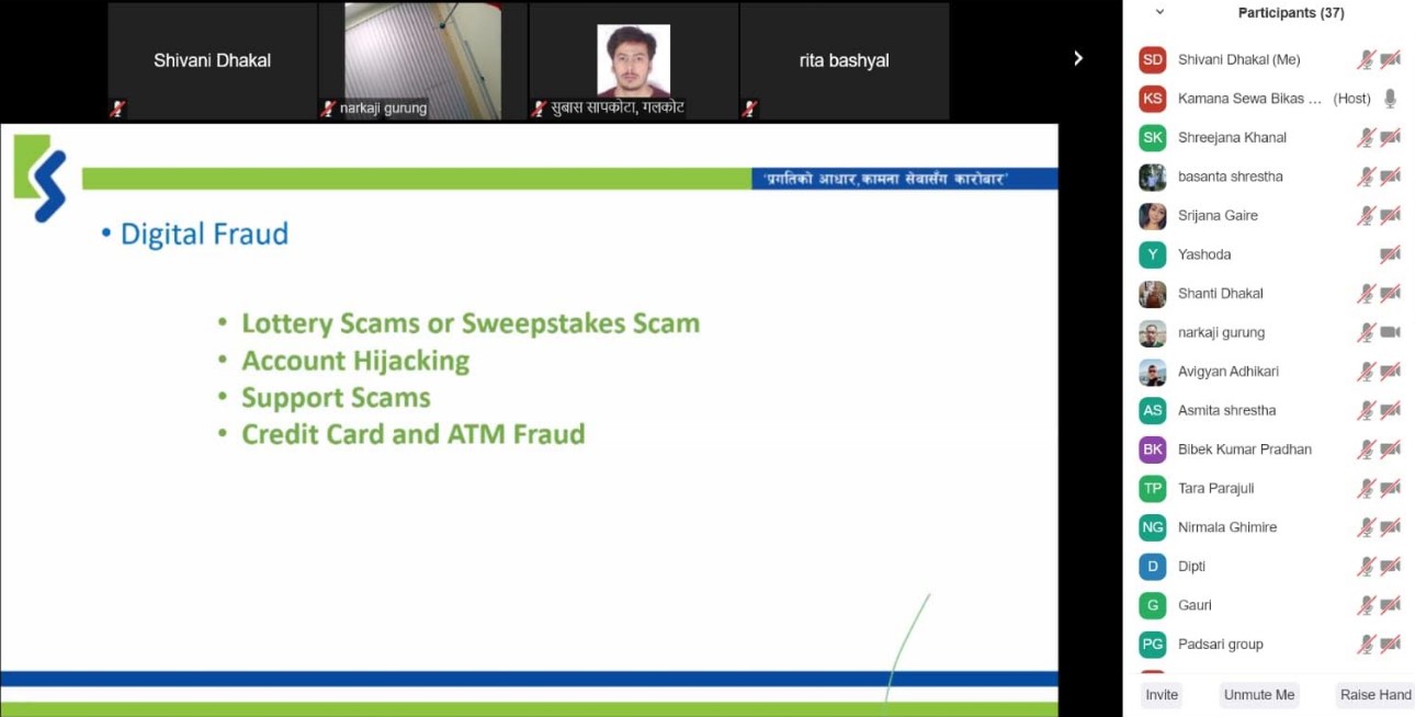 कामना सेवा विकास बैंकले आफ्नो ग्राहकलाई डिजिटल बैंकिङ्ग सम्बन्धी जानकारी तथा यसको उचित प्रयोग सम्बन्धी ज्ञान प्रदान गर्ने उद्देश्यले भर्चुअल माध्यमबाट सचेतना कार्यक्रम सञ्चालन गरेको छ ।