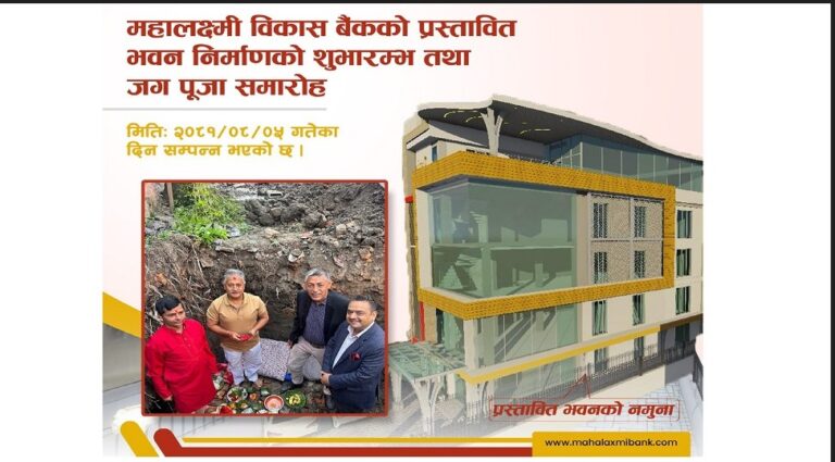 काठमाडौं – महालक्ष्मी विकास बैंकले काठमाडौं जिल्ला काठमाडौं महानगरपालिका वडा नम्बर ३० ज्ञानेश्वरमा आफ्नो कार्यालय भवन निर्माणको लागि भूमि पूजा कार्यक्रम सम्पन्न गरेको छ । सो भवन आगामी ९ महिनाभित्र निर्माण सम्पन गर्ने लक्ष्य लिइएको छ ।