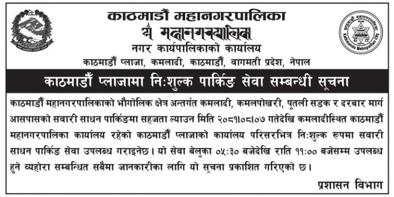 काठमाडौं – कमलादीस्थित काठमाडौं प्लाजामा आजदेखि निःशुल्क पार्किङ गर्न पाइने भएको छ । काठमाडौं महानगरपालिकाले आज सूचना जारी गरी महानगरको कार्यालय परिसर गाडी पार्किङका लागि खुला हुने जानकारी दिएको हो।
