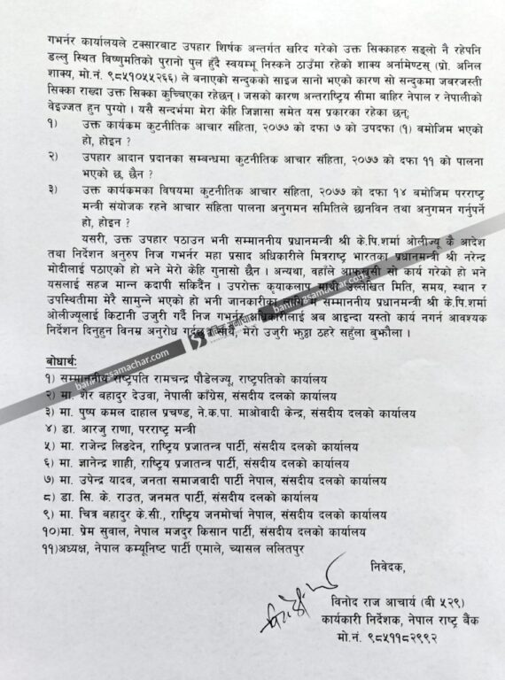 नेपाल राष्ट्र बैंकका कार्यकारी निर्देशक विनोदराज आचार्यले विभिन्न निकायमा कूटनीतिक मर्यादा परिपालना नगरेको भन्दै उजुरी दिएका हुन् । गभर्नर अधिकारीले भारतीय केन्द्रीय बैंक ‘रिजर्व बैंक अफ इन्डिया’ (आरबीआई) का गभर्नरमार्फत भारतीय प्रधानमन्त्री मोदीलाई उपहार पठाएको आरोप उजुरीमा लगाइएको छ ।