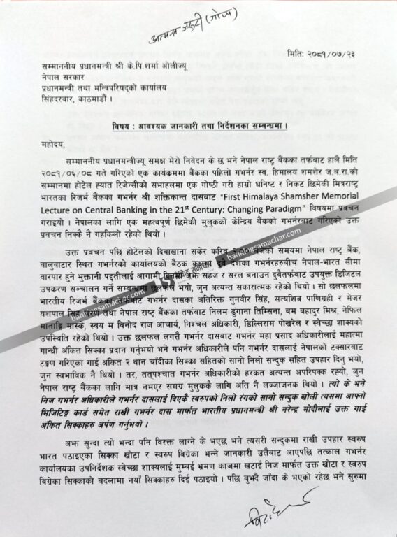 खासगरी, भारतीय केन्द्रीय बैंक आरबीआईका गभर्नर शसिकान्त दास असोज ८ गते काठमाडौंमा भएको नेपालका पहिला गभर्नर हिमालय सम्सेर जबराको स्मृतिमा आयोजित एक कार्यक्रमका लागि नेपाल आएका थिए । त्यसक्रममा गभर्नर अधिकारीले भारतीय गभर्नर दासलाई उपहार दिएका थिए ।