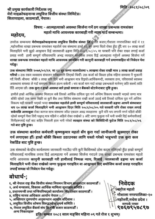 आफू र आफ्नो परिवारलाई पनि अभद्र व्यवहार गर्नेदेखि मानसिक तनाव दिएर आत्महत्या गर्नुपर्ने स्थितिमा पुर्याएको पत्रमा उल्लेख छ । सोहीकारण सम्बन्धित शाखा प्रबन्धकमाथि कारबाहीका लागि प्रमाणसहित निवेदन दिएको पीडितले उल्लेख गरेका छन् ।