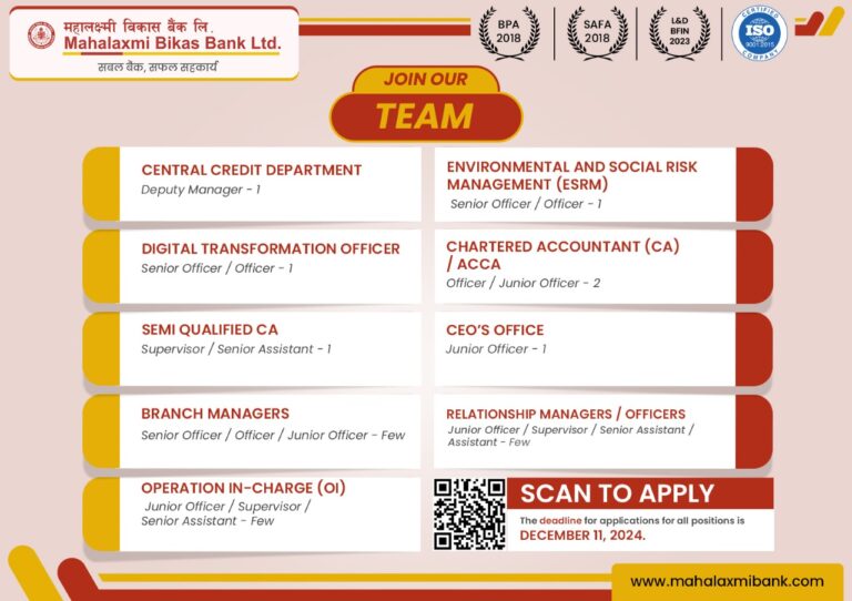 काठमाडौं – महालक्ष्मी विकास बैंक लिमिटेडले विभिन्न पदमा कर्मचारी माग गरेको छ । बैंकले एसिस्टेन्टदेखि डेपुटी म्यानेजरसम्मका पदमा रोजगारीको अवसर खुलाएको हो ।