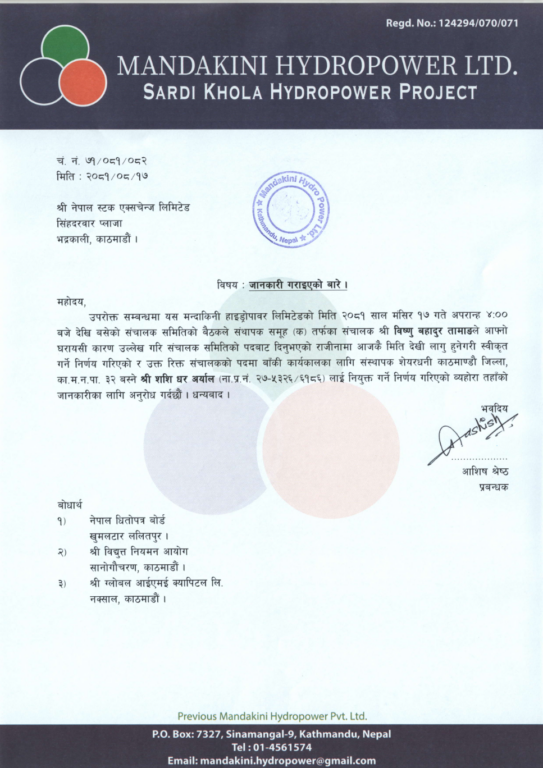 काठमाडौं – मन्दाकिनी हाइड्रोपावर लिमिटेडका संस्थापक संचालक समूह (क) तर्फ शशिधर अर्याल नियुक्त भएका छन् । पूर्व संसथापक सञ्चाालक विष्णु बहादुर तामाङले घरायसी कारण देखाइ राजीनमा दिएसँगै अर्याल संस्थापकमा नियुक्त भएका हुन् ।