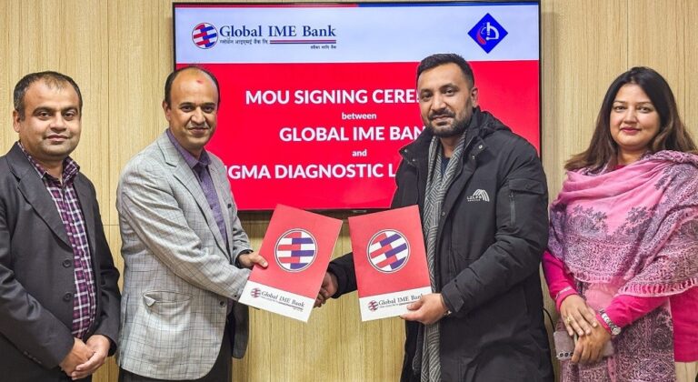 काठमाडौं – ग्लोबल आइएमई बैंक लिमिटेडका ग्राहकले सिग्मा डायग्नोसिस ल्याबमा ४० प्रतिशत छुट पाउने भएका छन् । ग्लोबल आइएमई बैंक र सिग्मा डायग्नोसिस ल्याबबीच छुट दिने समझदारीमा हस्ताक्षर भएको छ । समझदारीमा बैंकका सहायक महाप्रबन्धक तथा बाग्मती प्रदेश प्रमुख रुपेन्द्र वाग्ले र सिग्मा डायग्नोसिस ल्याबका ल्याबरोटोरी डाइरेक्टर बेद प्रकाश मिश्रले हस्ताक्षर गरे ।