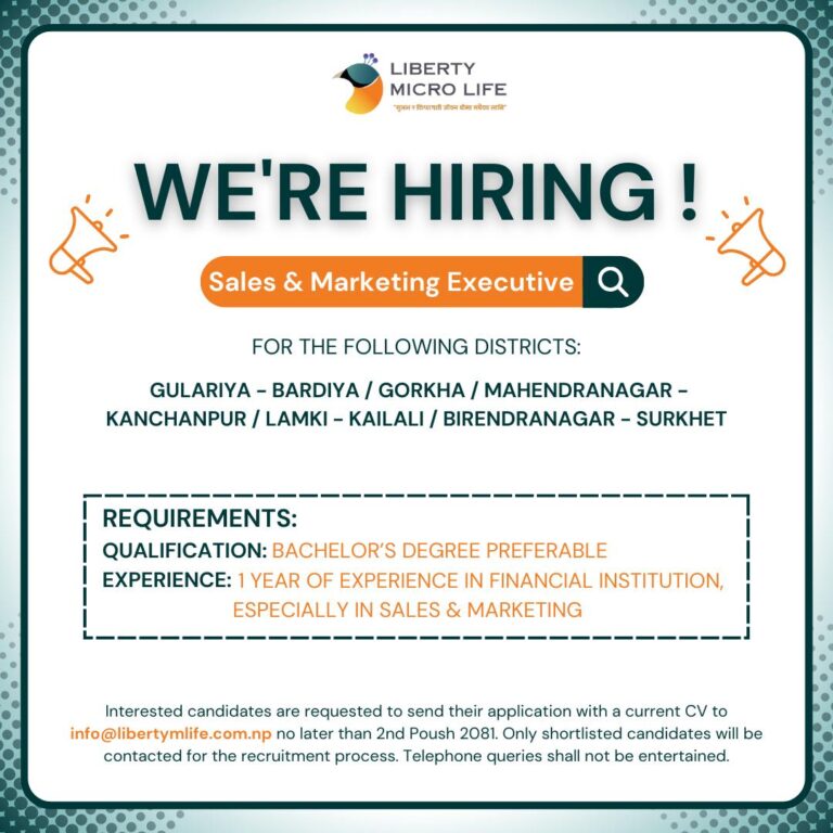 काठमाडौं – लिबर्टी माइक्रो लाइफ इन्स्योरेन्सले दरखास्तआह्रवान गर्दै ठूलो संख्यामा कर्मचारी माग गरेको छ । कम्पनीले उपत्यका बाहिरका शाखाहरुका लागि कर्मचारी माग गरेको हो ।
