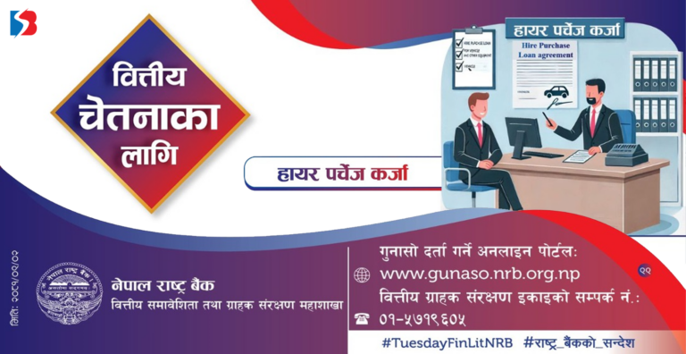 हायर पर्चेज कर्जा प्रवाह गर्ने कम्पनीले ग्राहकबाट ब्याजबाहेक अन्य शुल्क लिन नपाउने व्यवस्था रहेको छ । केन्द्रीय बैंकले वित्तीय चेतनाका लागि आज एक सूचना जारी गर्दै यो व्यवस्थाबारे जानकारी गराएको हो। बैंक वित्तीय संस्थाका अलावा केही अन्य कम्पनीले समेत राष्ट्र बैंकबाट स्वीकृति लिई हायर पर्चेज कर्जा प्रवाह गर्ने गरेका छन्।