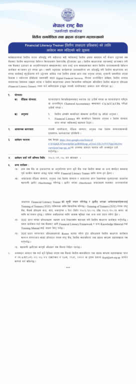 हाल भइरहेका वित्तीय साक्षरता कार्यलाई सुदृढीकरण गर्ने उद्देश्यले आर्थिक तथा वित्तीय क्षेत्रको ज्ञान तथा अनुभव भएको, भुक्तानी प्रणालीमा भएका विकास र नवीनतम प्रविधिको प्रयोगसँगै बढ्दो डिजिटल फाइनान्सियल सर्भिसेज, तिनमा अन्तर्निहित जोखिम, वित्तीय अपराधलगायतका विषयमा दख्खल भएका र वित्तीय साक्षरताको क्षेत्रमा क्रियाशील व्यक्तिहरु सम्मिलित वित्तीय साक्षरता प्रशिक्षक तयर गर्न लागिएकोले इच्छुकले आवेदन दिन सक्ने राष्ट्र बैंकले जनाएको छ।